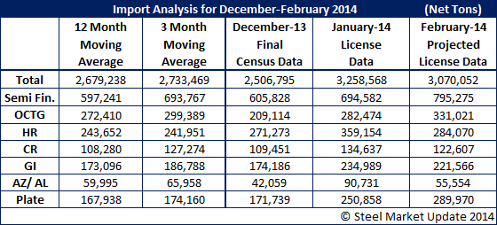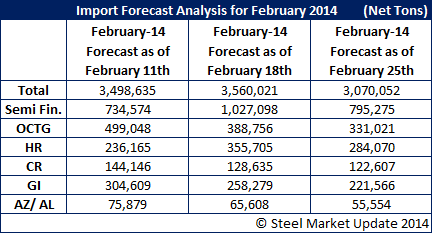 This is the fourth week in February and our third forecast regarding foreign imports into the United States. What Steel Market Update does each week (except the first week of the month) is to review the U.S. Department of Commerce import license data and then, based on the most recent numbers, project import levels by product for the month. Based on import license data through February 25th (today) we believe total imports on all steel products will be just over 3,000,000 net tons.