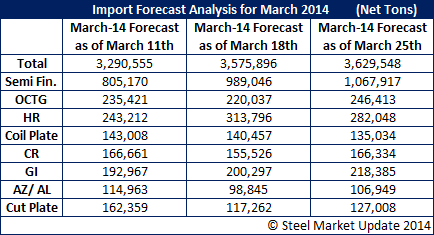 Regular Steel Market Update readers know we project steel imports into the United States for the current month based on the revised weekly license data released by the U.S. Department of Commerce. Based on data released earlier today, imports are now forecast to exceed 3.5 million tons (3,629,548 tons) which, if correct, would be the first time imports exceeded this level since sometime in 2006.