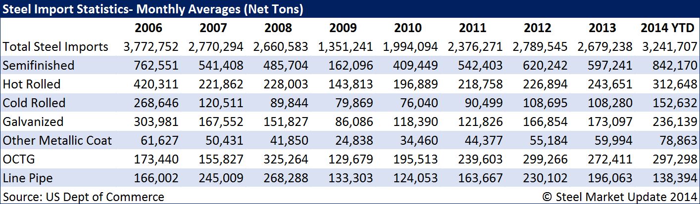 We are seeing increases at high levels (2007-2013) on hot rolled, cold rolled, galvanized, other metallic and oil country tubular goods (OCTG). When compared to 2006 which was a strong year for the industry; slabs, other metallic (mostly Galvalume) and oil country tubular goods (OCTG) exceed the 2006 import levels.