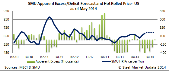 In the graphic below we track hot rolled steel price movement and service center inventories. As you can see, as prices moved into deficit during 2013 prices began to rise (albeit modestly). We are seeing the same price movement with the deficits recorded so far this year. We are forecasting a relatively flat price cycle through the September time period.