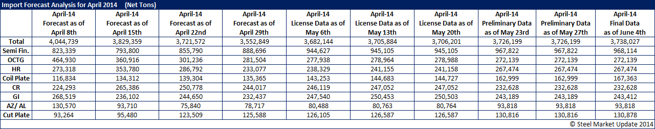 In the table below you can see how April imports stand up against the previous month (March 2014) as well as the 12 month and 3 month moving averages. In each case we would have to consider the 3.7 million net tons as representing a “surge” in imports. US DOC license data now compiled through June 4th indicates the surge of imports will continue into the month of May.