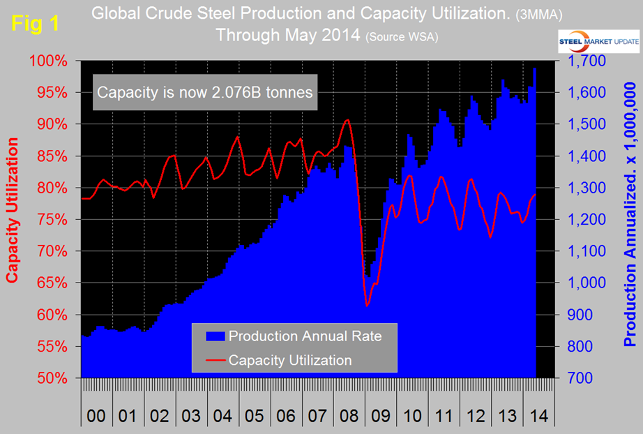 Global steel mill production in May on a tons per day basis was 4.554 million tonnes. The last three months have all been greater than 4.5 million for the first time ever which drove the three month moving average (3MMA) of production in May to another all-time high annual rate of 1.677 billion tonnes and a capacity utilization of 78.9 percent, (Figure 1).