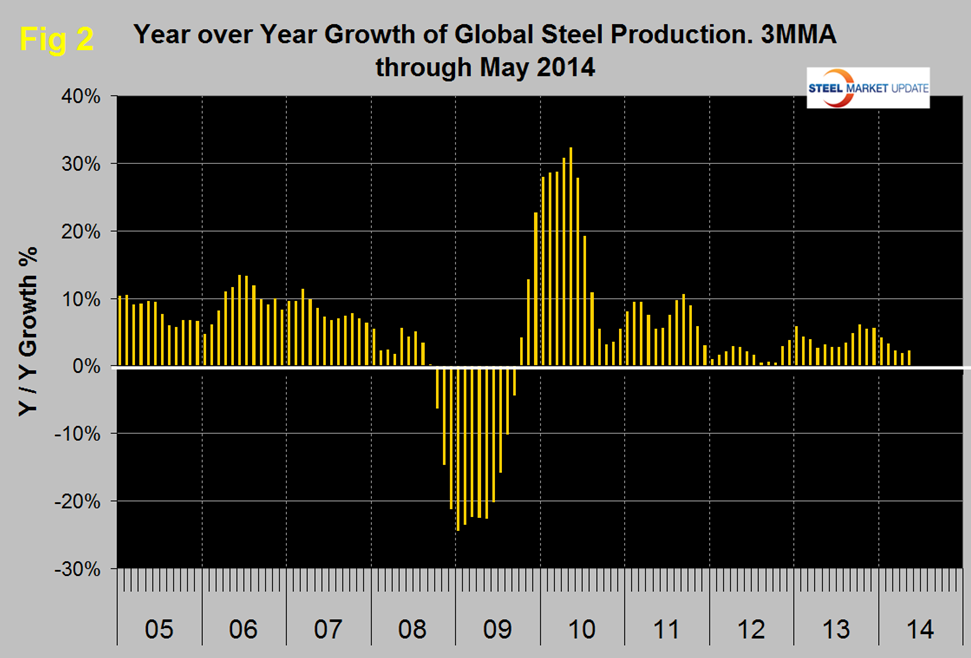 In three months through May year over year (y/y) growth was 2.2 percent. All regions except the CIS, other Europe and South America had positive y/y growth in three months through May which was a repeat of the three months through April. The European Union continuing to lead the way with a 4.6 percent year over year growth rate. Growth of output in the NAFTA was 1.5 percent year to date. The growth of China’s steel output YTD through May was 2.3 percent down from 12.4 percent in March last year. It is still too soon to tell if the growth of China’s production really is being reigned in but the signs are encouraging. North America and China produced 7.2 percent and 49.9 percent of the global total in May respectively. Figure 2 shows the y/y growth of global production which has been slowing in 2014. (Source World Steel Association)
