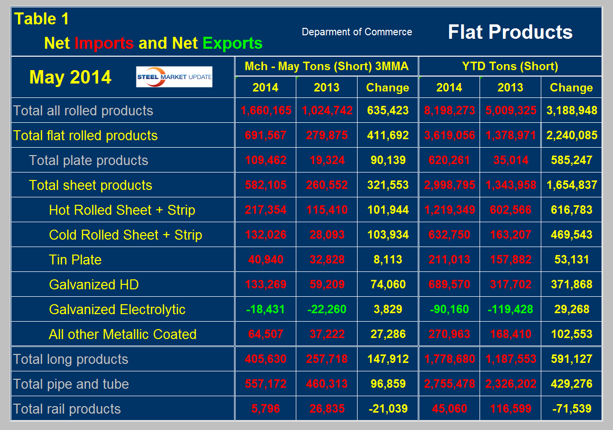 Table 1 shows net imports by product. Year to date through May, total flat rolled net imports were 3,619,056 tons of which 2,998,795 tons were sheet products. Net sheet imports more than doubled y/y being up by 1,654,837 tons. Net imports increased on all products except rail, led by hot band which increased by 616,783 tons. Electro-galvanized was the only product to have a trade surplus in 2013 and 2014 year to date but this surplus declined in 2014.In Table 1 negative net imports, (which means a trade surplus) are shown in green.