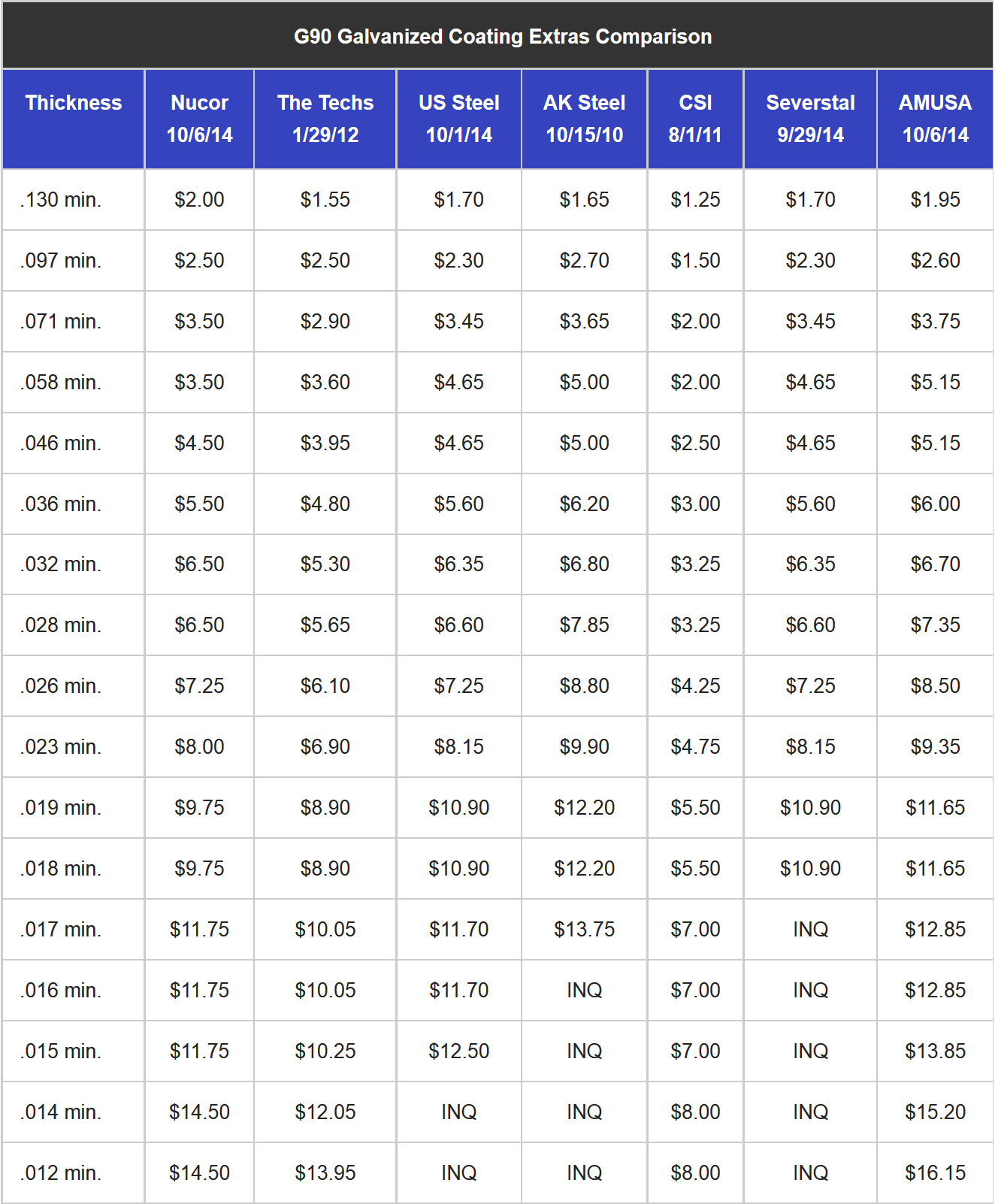 Buyers of galvanized steel know that one of the most critical pieces of building pricing is adding the cost charge by the steel mill to apply zinc to steel. If you have had a chance to explore the ‘Resources‘ section of the Steel Market Update website, you may have come across our Steel Mill section where we house furnace status information, individual mill price extras, a comparison of coating extras, etc. With many of the mills recently announcing revised galvanized coating extras, we have updated a number of the mills extras and we are revising our mill by mill comparison. Below is a snapshot of the galvanized G90 table from the ‘Galvanized Extras‘ page.