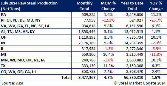 The American Iron & Steel Institute (AISI) reported their final raw steel production numbers for the month of July 2014. This estimation is different than the weekly raw steel production as it is based on 75 percent of the domestic mills reporting vs. 50 percent for the weekly estimates.