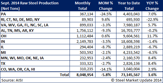 The American Iron & Steel Institute (AISI) reported their final raw steel production numbers for the month of September 2014. This estimation is different than the weekly raw steel production as it is based on 75 percent of the domestic mills reporting vs. 50 percent for the weekly estimates.