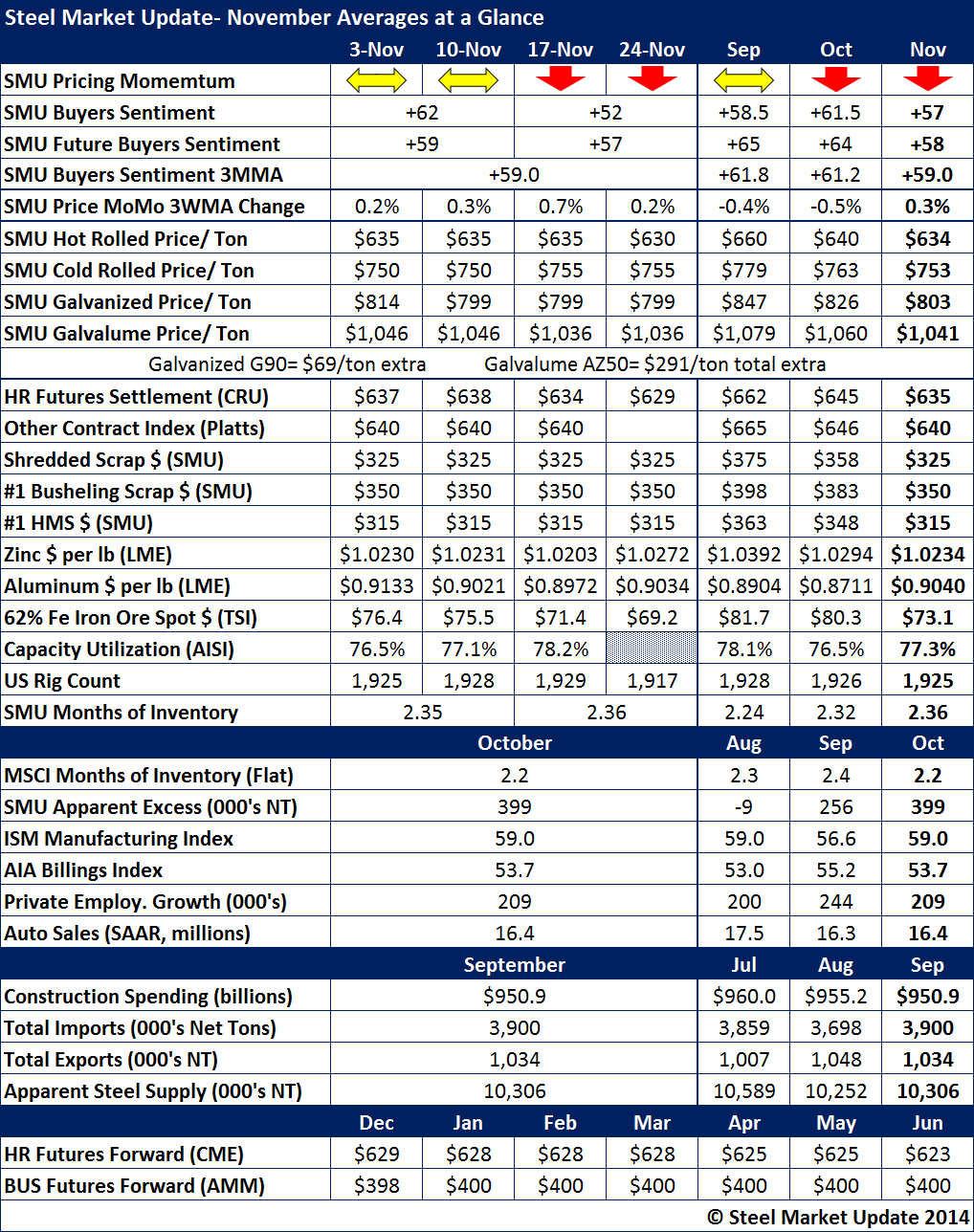 Steel Market Update (SMU) benchmark hot rolled coil pricing averaged $634 per ton ($31.70/cwt) for the month of November. CRU HRC averaged $635 per ton ($31.75/cwt) while Platts averaged $640 per ton ($32.00/cwt).