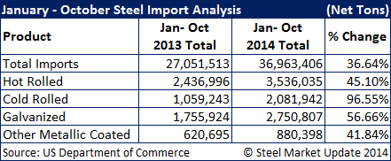 As you can see total imports (all products) were up 36.64 percent. However, flat rolled steel, led by cold rolled out of China, are all up significantly year-over-year (YOY). Hot rolled is up 45.10 percent, cold rolled +96.55 percent, Galvanized +56.66 percent and Galvalume +41.84 percent.