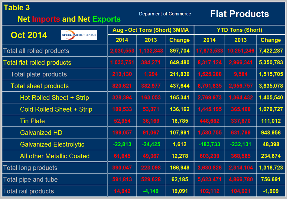 Table 3 shows net imports by product. Year to date through October, total flat rolled net imports were 8,317,124 tons of which 6,791,835 tons were sheet products. Net sheet imports more than doubled y/y being up by 3,835,078 tons. Net imports increased on all products except rail which were down slightly. Electro galvanized was the only product to have a trade surplus in 2013 and 2014 year to date but this surplus declined in 2014. In Table 1 negative net imports, (which means a trade surplus) are shown in green.