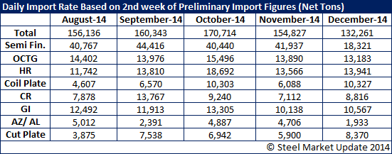 Last year we saw December imports totaling 2.6 million net tons. At this moment we are seeing imports trending toward 3.0-3.5 million net tons. This is based on the daily import rate (seen below) which is lower at this point in the month than what we saw in any of the previous four months. August imports totaled 3.7 million net tons and we do not expect December to reach that level due to the lower levels we are seeing in semi-finished which tend to account for as much as 20-25 percent of the total imports during any given month.