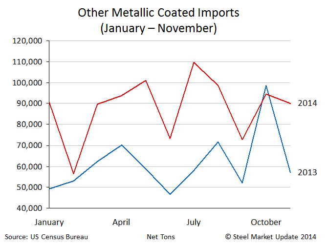 Other metallic, most of which is Galvalume, totaled 1.0 million net tons during the first 11 months 2014. This is 300,000 net tons more or 43.1 percent higher than the 700,000 tons received in 2013.