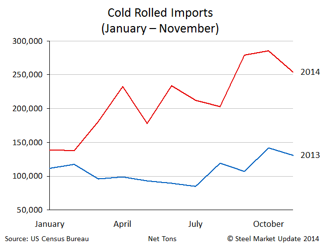 Cold rolled imports for 2014 came in at 2.3 million net tons during the first 11 months 2014. This is 1.1 million tons more or 96.3 percent than the 1.2 million net tons received during the first 11 months 2013.