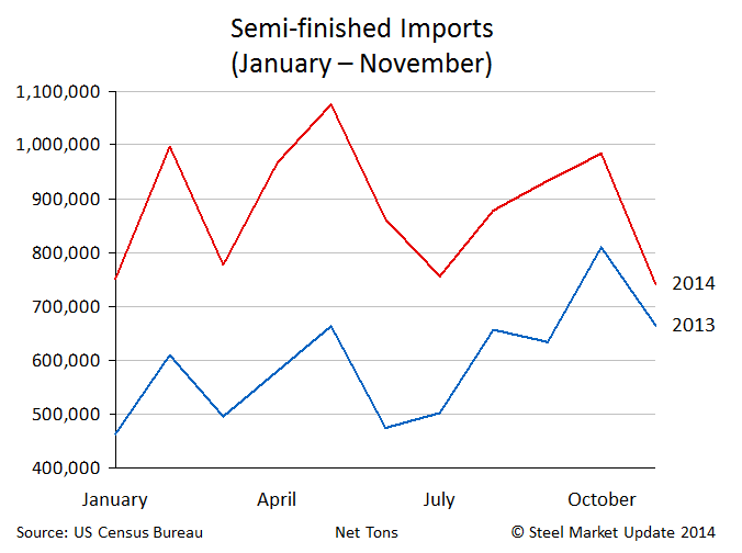 Semi-Finished imports (slabs) totaled 9.7 million net tons during the first 11 months 2014, this is up from 6.6 million net tons for the first 11 months 2013. This is an increase of 3.1 million tons or 48.2 percent from one year to the next.