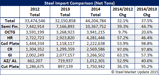 Comparing December 2014 against the previous two years we find that this year is up 44.5 percent over December 2012 and 42.2 percent above December 2013. As you look at the table below you get a better sense as to what items have been surging this year over the past two years: OCTG, coiled plate, hot rolled, cold rolled, Galvalume (other metallic) and cut plate. Semi-Finished (mostly slabs) and galvanized were close to what we saw the previous two years.