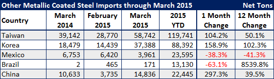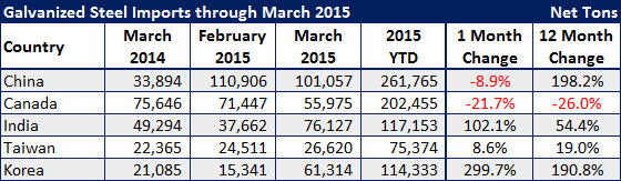 Galvanized has three countries showing significant growth in exports of the product to the United States: China, South Korea and India.
