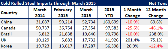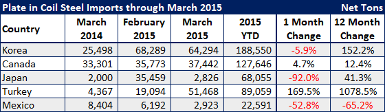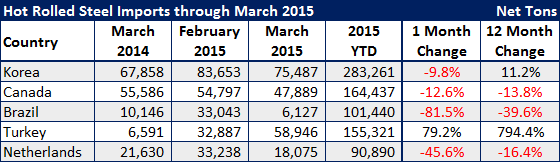March imports are trending toward another very large month. We expect that when the final numbers are released, the month will come in about 3.6 to 3.8 million net tons which would be in line with our 12 month moving average of 3.7 million net tons. Last March imports were 3.2 million net tons. Note that March 2015 data is based on license data through the 24th and projected out through the entire month, and February 2015 data is preliminary census data. Therefore, the March figures are subject to change.