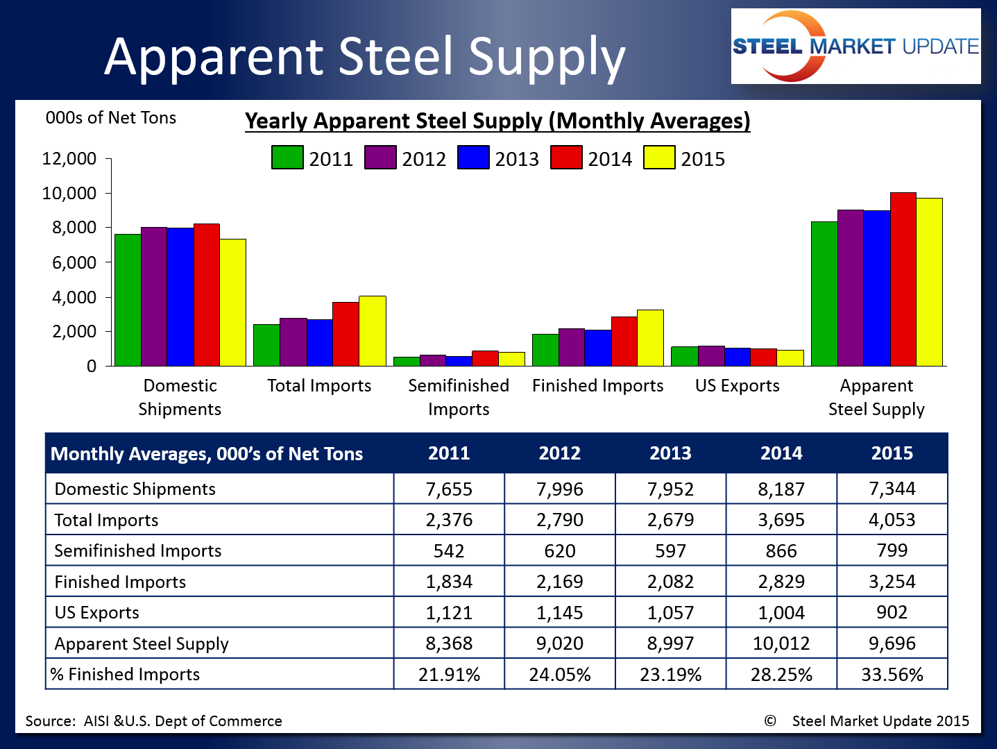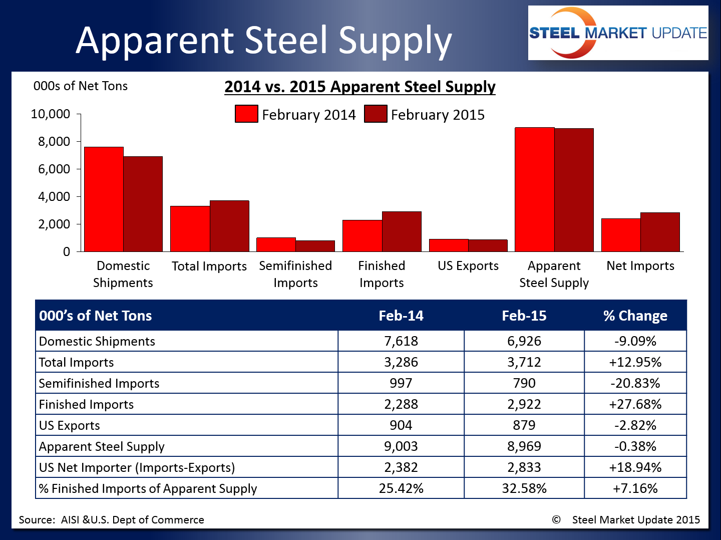 According to the latest data released from the US Department of Commerce and the American Iron and Steel Institute, apparent steel supply for the month of February 2015 is 8,968,831 net tons. Apparent steel supply is calculated by adding domestic steel shipments and finished US steel imports and subtracting total US steel exports.