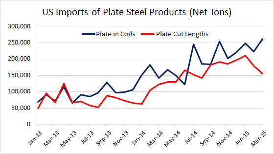 Below is a graphic showing imports of plate in coils and plate cut lengths since January 2013. Tonnage is in net tons.