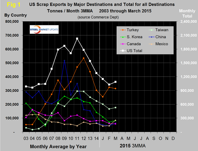 In the twelve months of 2014, scrap exports totaled 15,308,000 tonnes, down by 17.1 percent from the same period in 2013. In the first three months of this year exports were 3,254,765 for an annual rate of 13,019,060 tonnes. The tonnages shown in Figure 1 are based on three month moving averages for 2015 and on the twelve month average for previous years. The graph shows that the monthly average declined for three consecutive years, 2012 through 2014 and the decline continued through January and February this year. March saw a trend reversal.