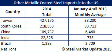 In coated products galvanized is the item with the most tons attached to the foreign imports. Three hundred thousand tons of galvanized is as much as produced by Nucor Berkeley, NLMK USA (Sharon Coatings), SDI Butler, The Techs, US Steel Fairfield and CSN in Terre Haute, Indiana. In other words imports have a major impact on domestic production. In the table below we are providing the monthly averages for China, Taiwan, South Korea, Indiana and Brazil for galvanized exports out of each country to the United States in calendar year 2014 and again for the first four months 2015.
