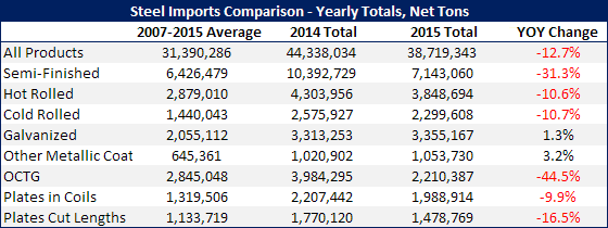 Foreign steel imports for calendar year 2015 came in at 38,719,343 net tons. This represents a 12.7 percent reduction in tonnage compared to 2014. However, 2015 is still well above the average of imports seen over the past seven years. We saw large reductions in tonnage for semi-finished (mostly slabs), hot rolled, cold rolled, plates (cut length and coils) and OCTG. Coated products were one area where we actually saw a slight increase which is a bit of a surprise considering the corrosion resistant trade suit was the first one filed back in early June 2015.