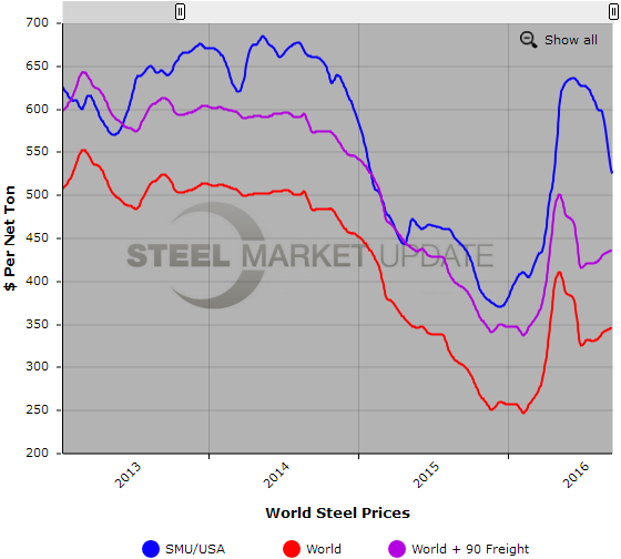 Below is a graph comparing SteelBenchmarker world HR export prices against the SMU domestic HR average price (we will build new data using Platts and replace the SteelBenchmarker data in the months ahead). We also have included a comparison with freight and traders’ costs added which gives you a better indication of the true price spread. You will need to view the graph on our website to use it’s interactive features, you can do so by clicking here. If you need assistance with either logging in or navigating the website, please contact us at 800-432-3475 or info@SteelMarketUpdate.com.