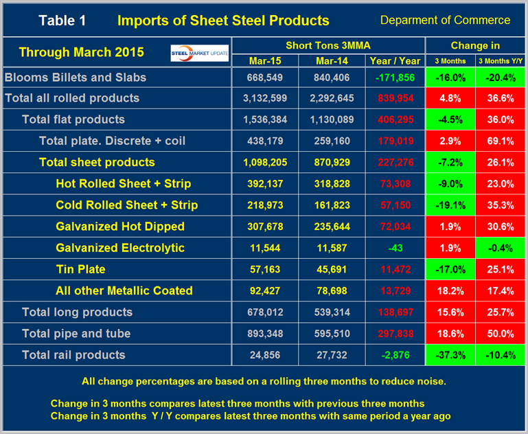 Table 2 shows the same analysis for long products. For total long products the tonnage was up by 15.6 percent, 3M/3M and by 25.7 percent y/y. There was a tremendous surge in rebar in the Q1 of this year when the volume was up by 51.1 percent compared to the Q4 2014. With the exception of wire rod, other long products declined in the 1st quarter. Imports of pipe and tube continue to surge but rail fell by 37.3 percent in the 1st quarter.