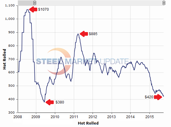 The lowest price recorded for hot rolled coil by the Steel Market Update index was $380 per ton (average) back in June 2009. Prices remained at that level for two weeks before bouncing back from there.