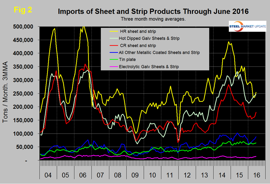 Imports of semi-finished in June were 586,745 tons with a three month moving average of 572,659 tons. The June semi-finished volume was down by 8.0 percent from the monthly average of 2015. February this year had a very low volume of semis as shown by the red line in Figure 1. The 3MMA of flat rolled imports peaked at 1,634,000 tons in November 2014 and fell to 1,008,718 in April and picked up slightly in to reach 1,085,763 tons in June. “Flat” includes all hot and cold rolled sheet and strip plus all coated sheet products plus both discrete and coiled plate. Long product imports have been range bound between 519,000 tons and 772,000 tons since March 2014 with no particular trend evident. In June the 3MMA of long product imports was 576,222 tons.
