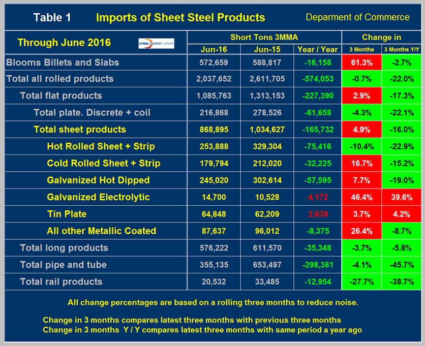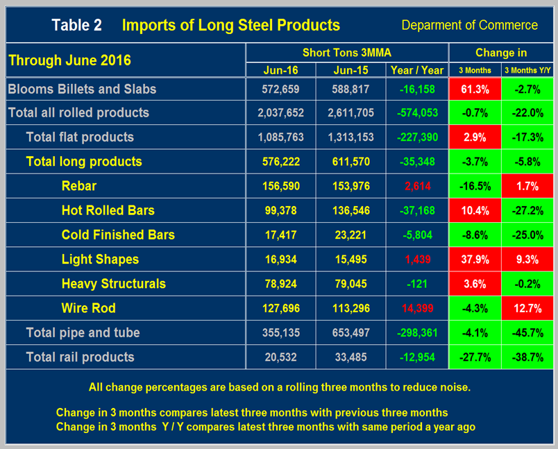 It compares the average monthly tonnage in the latest three months through June with both three months through March (3M/3M) and three months through June 2015 (Y/Y). On a Y/Y basis the total of all rolled products was down by 574,053 tons or 22.0 percent, as total sheet products were down by 16.0 percent. Tubular products were down by 45.7 percent. Semi-finished slabs, blooms and billets were down by 2.7 percent and long products were down by 5.8 percent. Electro-galvanized and tin plate were the only sheet products to have a Y/Y increase. There was an increase in many categories on a 3M/3M basis as indicated by the color code red. The extremely large 3M/3M increase in semis was a result of the very low February volume. The total volume of hot worked products was up by 0.7 percent 3M/3M driven entirely by sheet products which all except for hot rolled increased. The color codes in Tables 1 and 2 for the three month and year over year change show which products are improving and which have experienced import volume increases in these two time frames.