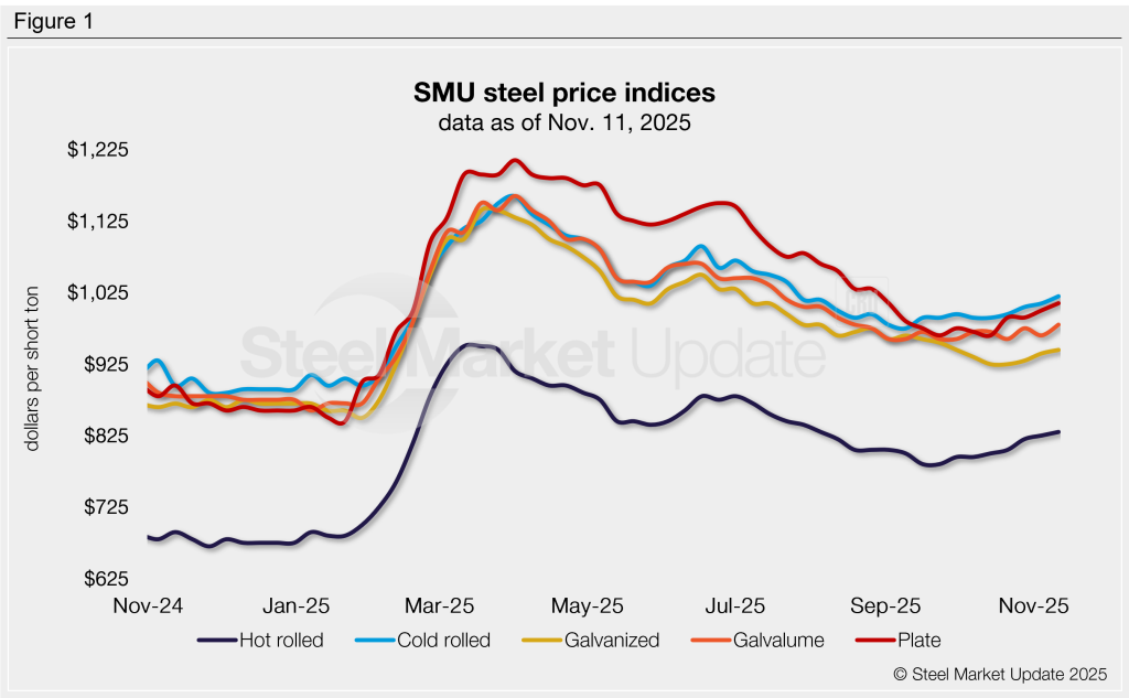 SMU note: The graphic above shows a history of our hot rolled, cold rolled, galvanized, Galvalume, and plate prices. This data is also available on our website with our interactive pricing tool. If you need help navigating the site or logging in, contact us at smu@crugroup.com.