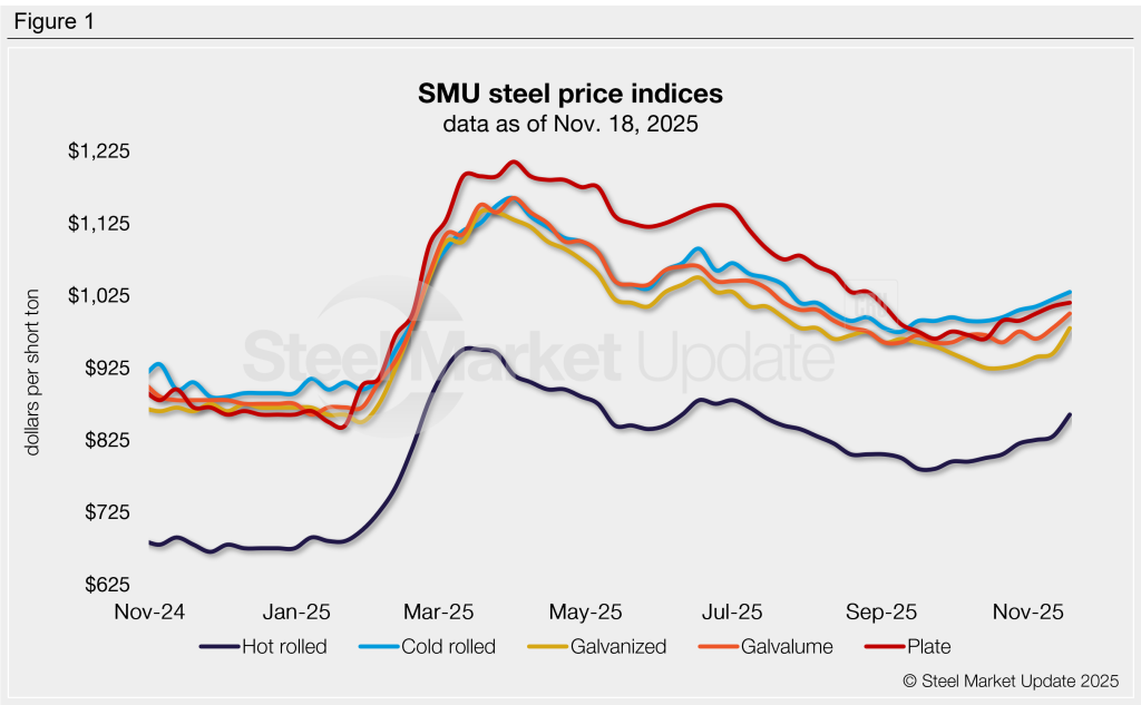 Hot-rolled lead times range from 3–8 weeks, averaging 5.3 weeks as of our Nov. 13 market survey.