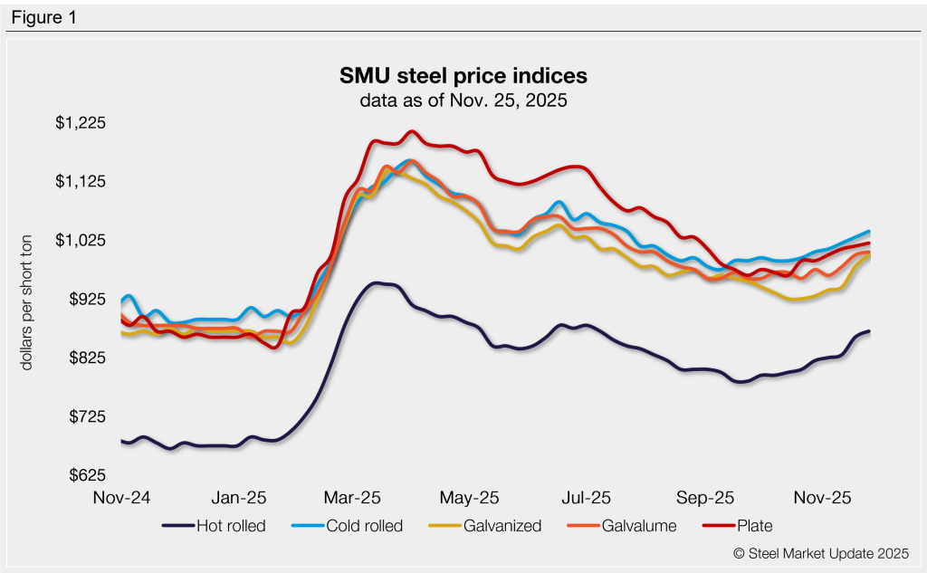 All five of SMU’s sheet and plate price indices increased this week for the second week in a row, with tags inching up to new multi-month highs. Prices are now up $30-70/st compared to four weeks ago.