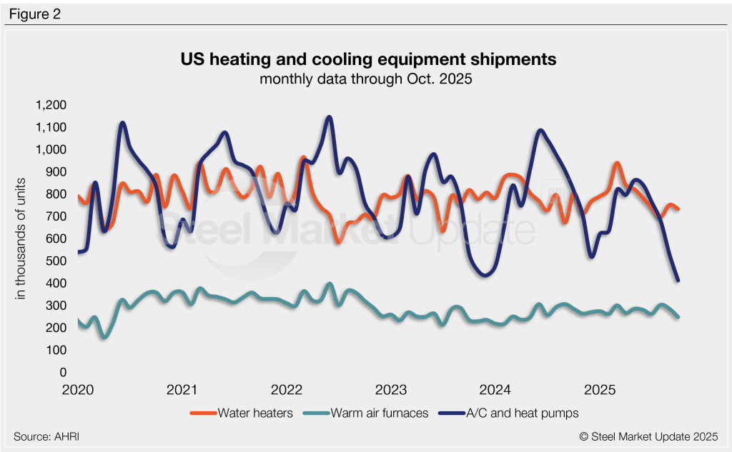 October shipments have generally been slightly above average, but this October came in much softer than usual. Shipments totaled 1.39 million units, 27% less than the same month last year (Figure 1, left), and the lowest total since February 2017. And shipments of warm-air furnaces and air conditioners/heat pumps both declined month over month (m/m), as did water heater shipments.