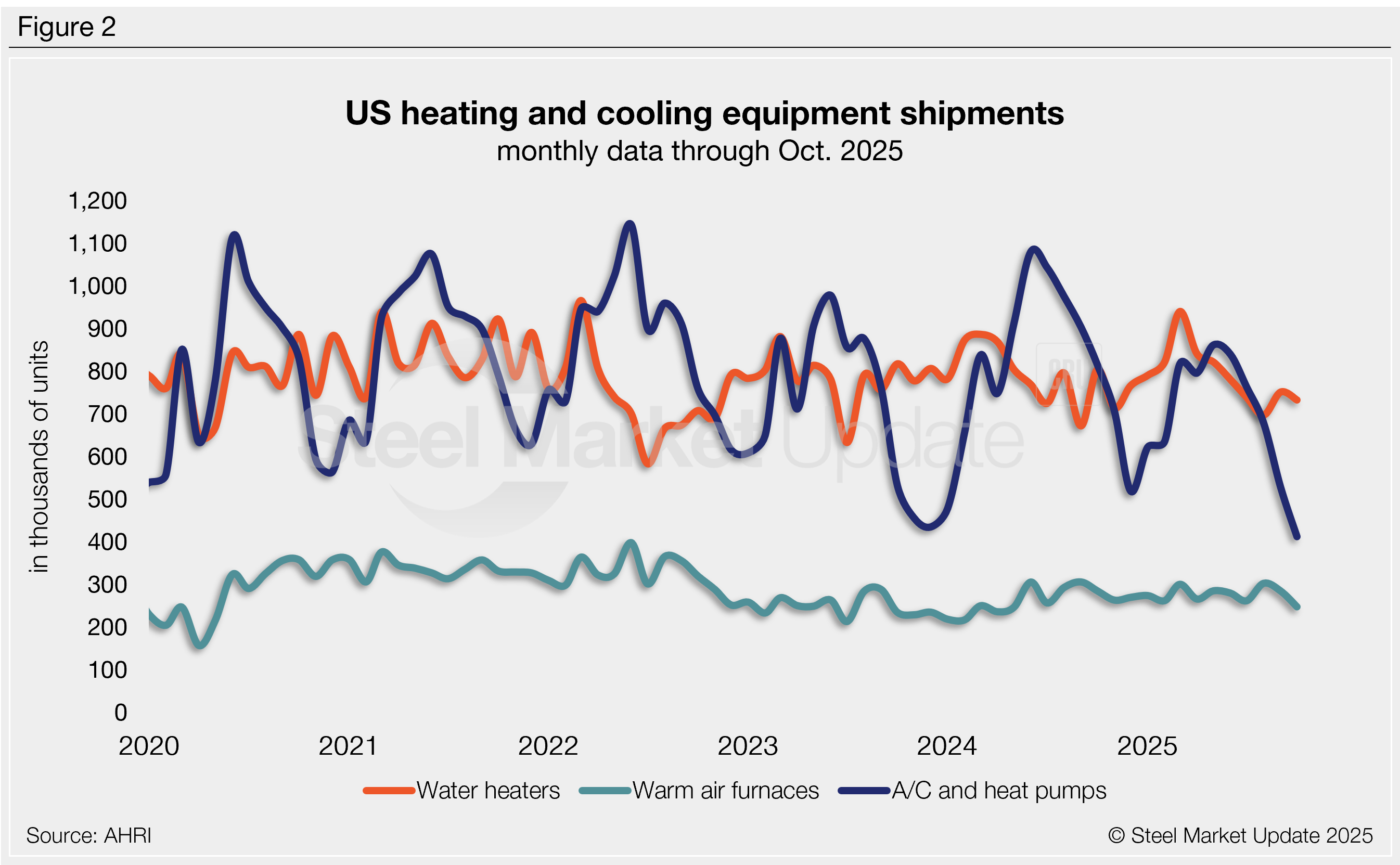 - Air conditioners and heat pump shipments fell 22% m/m to a nine-year low of 413,000 units. October shipments are down 49% y/y, marking the sixth consecutive month of negative annual growth. Note that these shipments are highly seasonal, as shown in Figure 2.