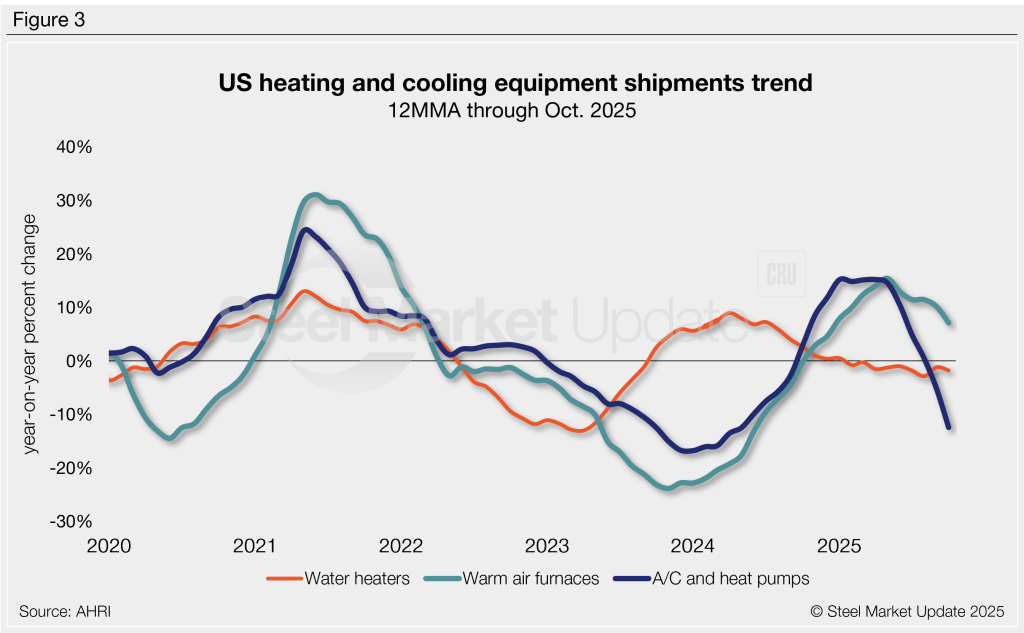 - Air conditioner and heat pump shipments were down 12% y/y on a 12MMA basis. After 11 months of annual growth, October marks the second straight month of contraction; the 12MMA growth rate has declined sharply since May.