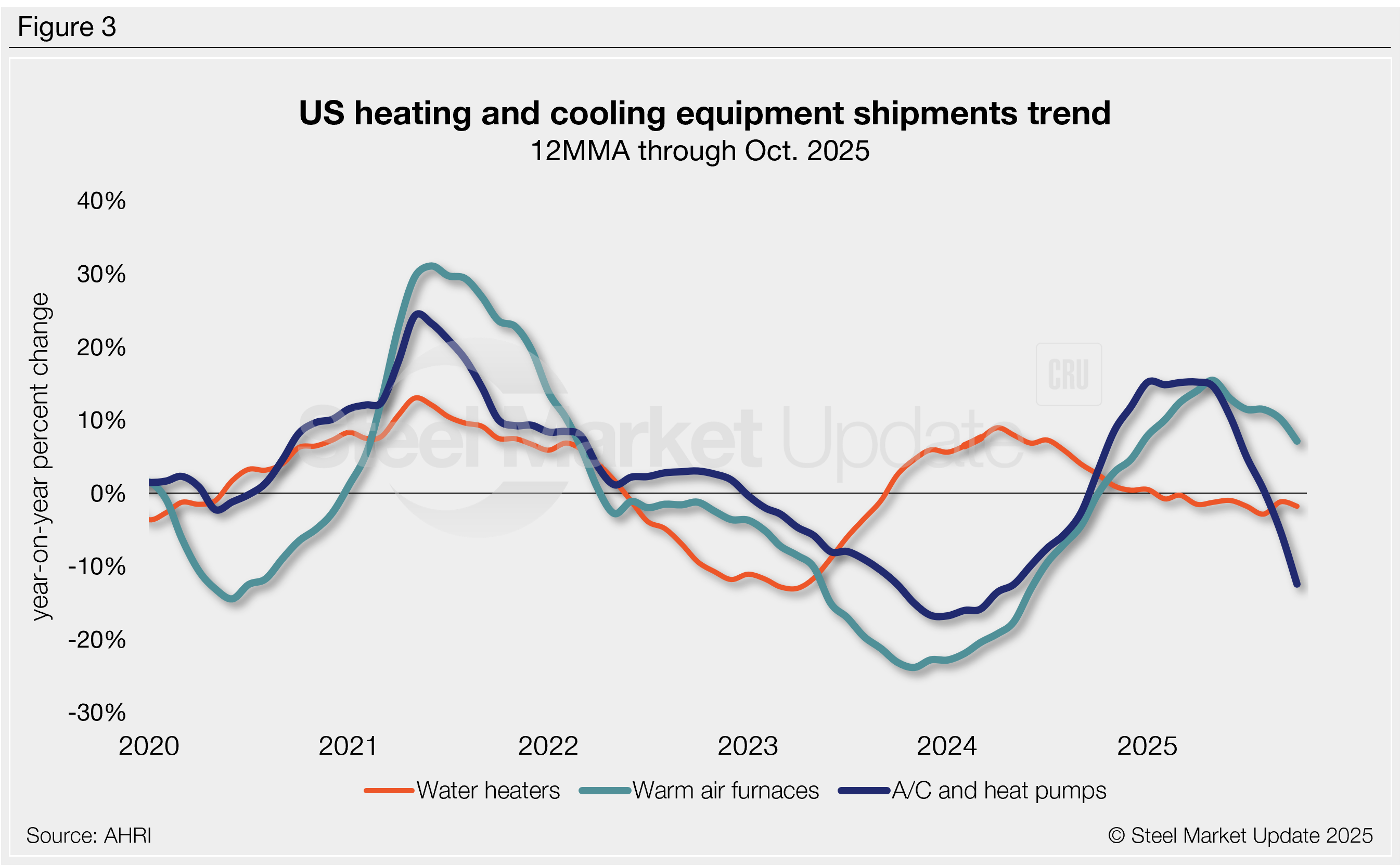 Figure 3 shows the annual growth rate of shipments by product on a 12MMA basis. From this angle, annualized warm-air furnaces shipments remain strong, while air conditioners/heat pumps and water heater shipments are down: