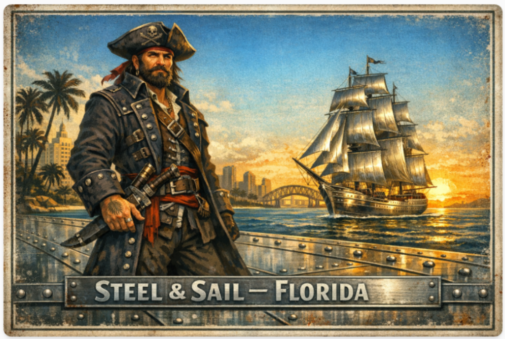 I thought of making a postcard for the event. I’m no graphic designer, so I asked our proprietary AI tool to generate one. I suggested it incorporate steel, pirates, and palm trees. Here is what it came up with: