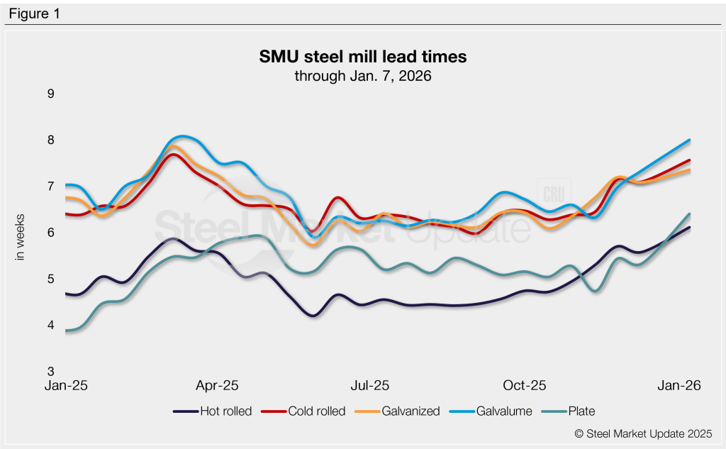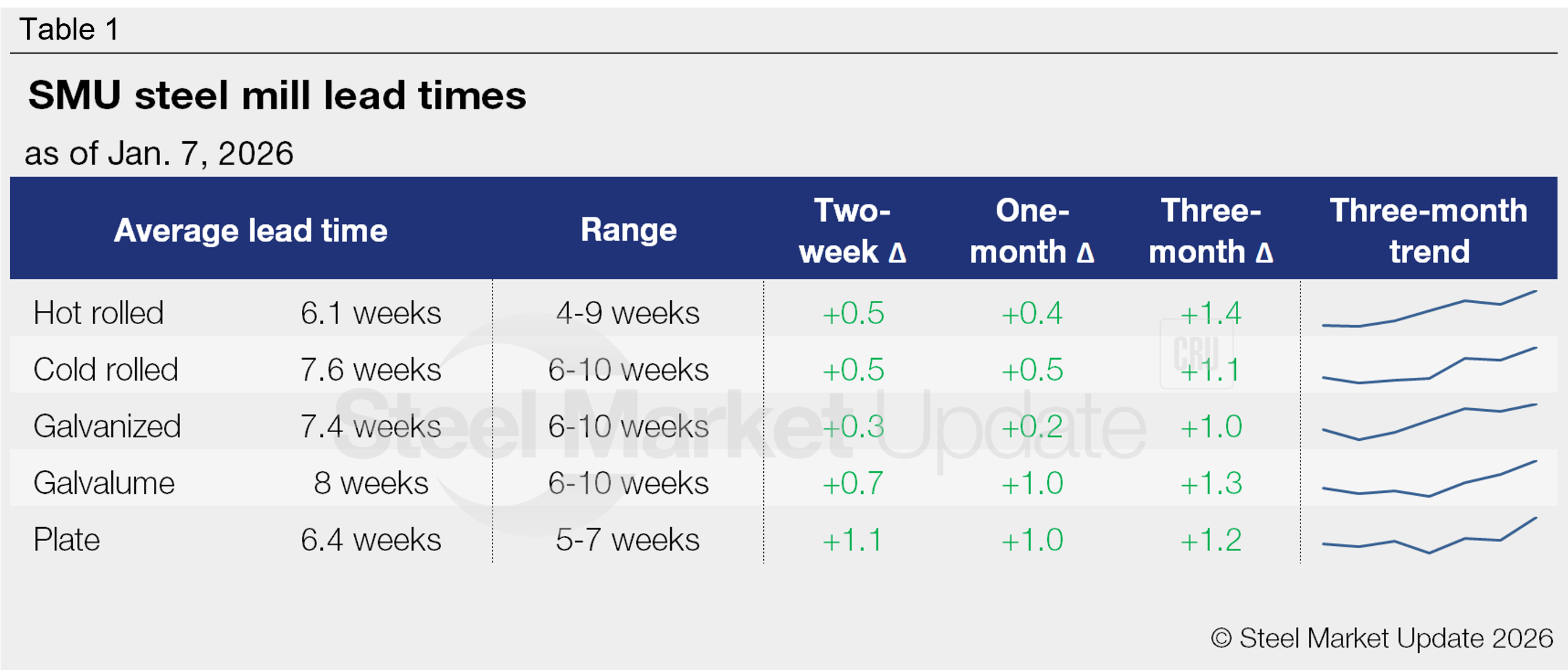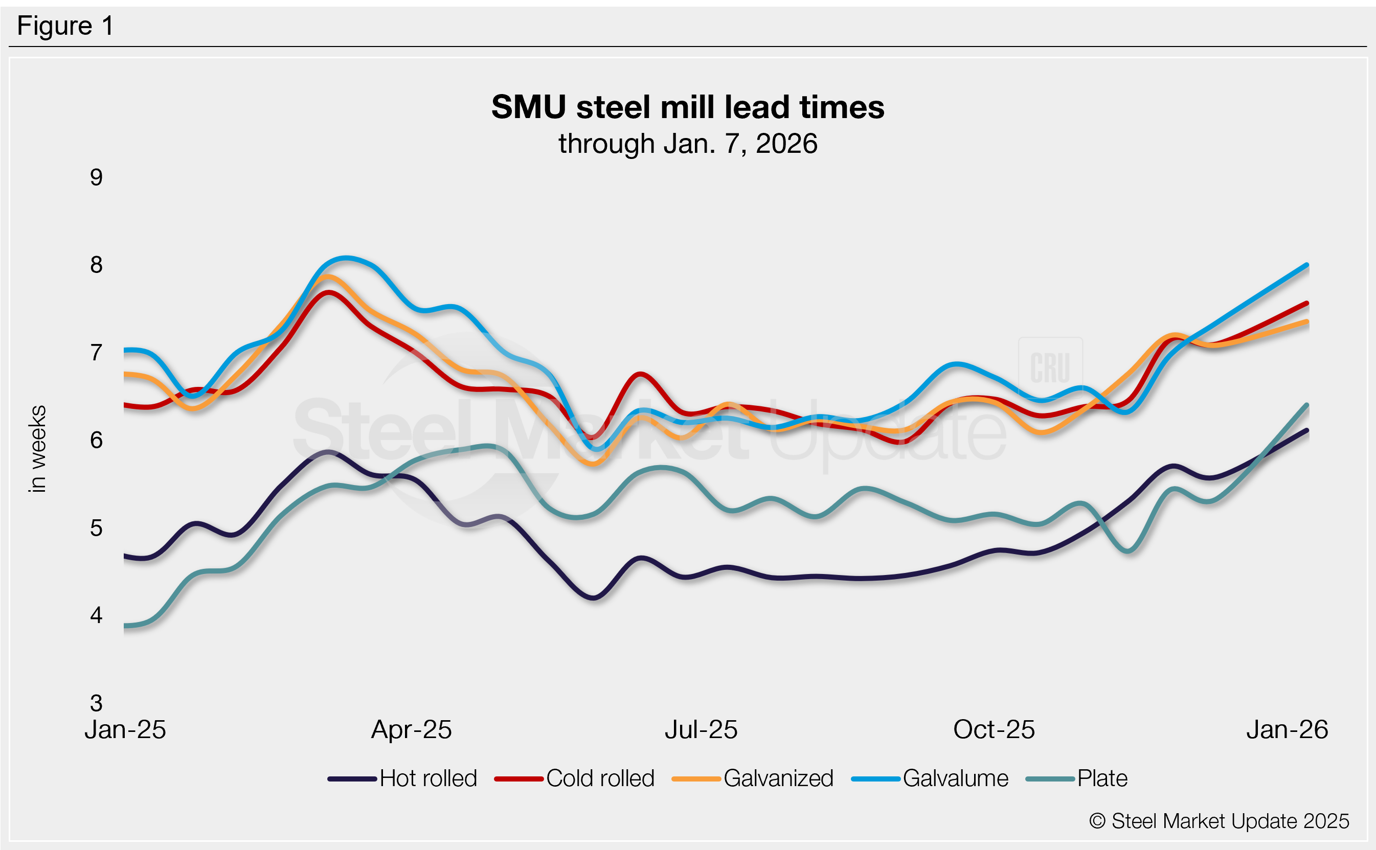 Following the brief pause seen in mid-December, steel mill lead times for both sheet and plate products have resumed their upward trend this week, according to responses from SMU’s latest market survey.