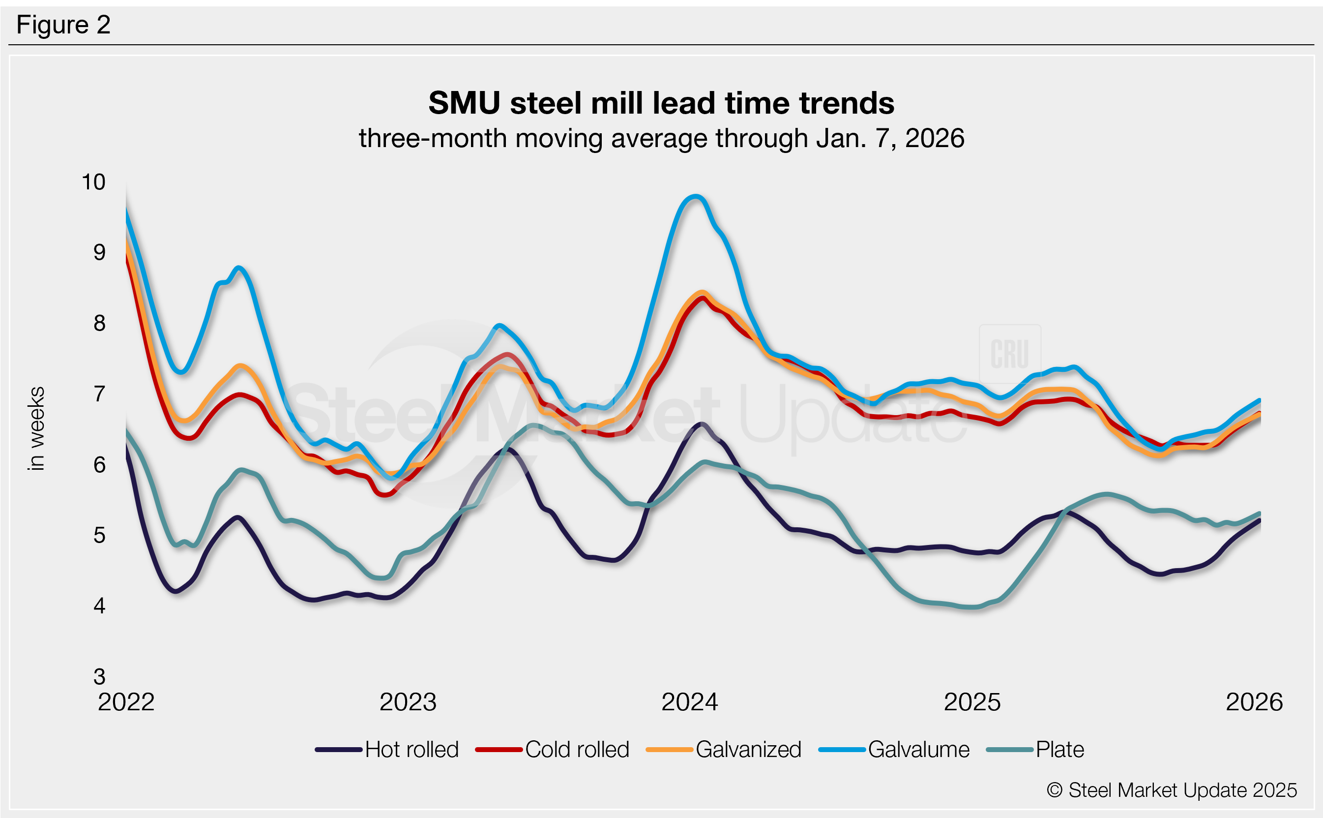 To highlight broader trends, lead times can be calculated on a three-month moving average (3MMA) basis (Figure 2). All sheet and plate 3MMAs increased this week compared to mid-December.