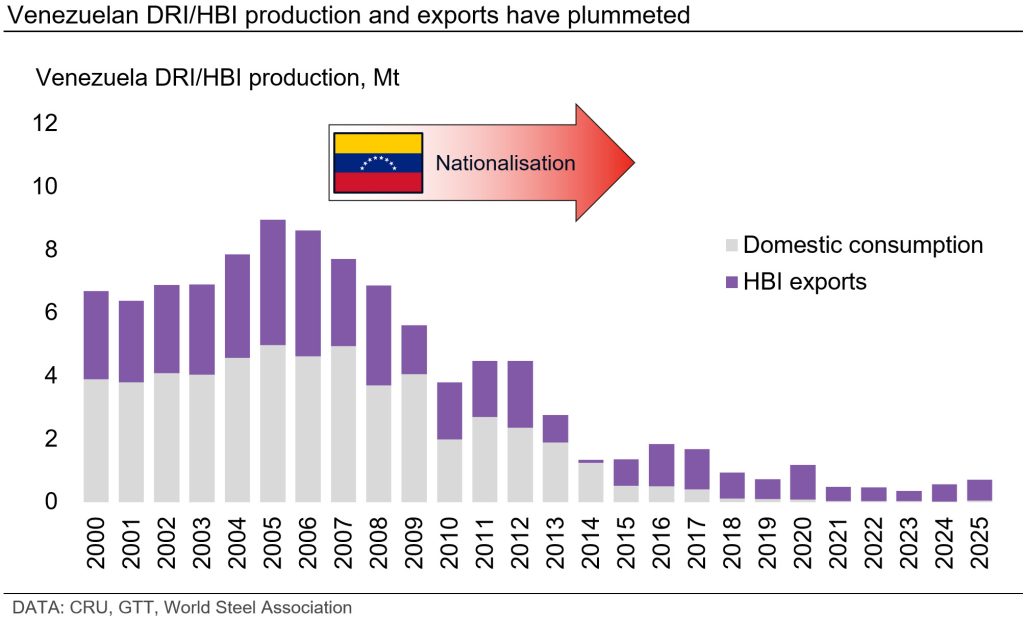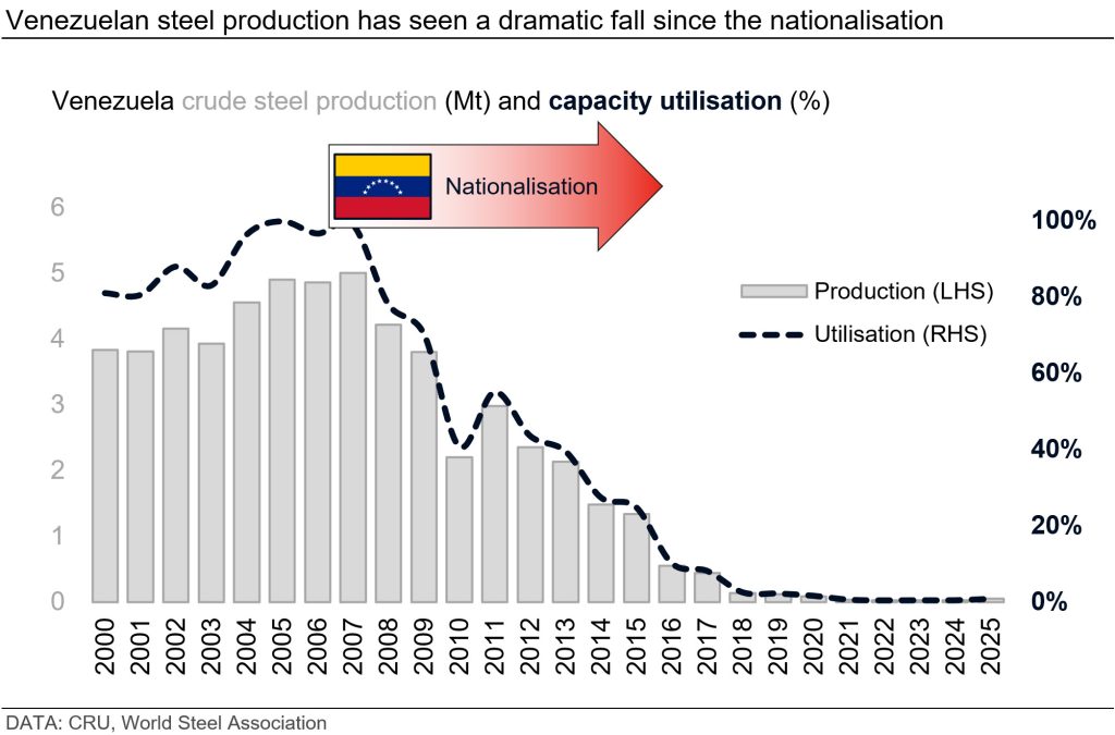 On Jan. 3, the USA carried out a military operation in Venezuela that resulted in the arrest of the country’s President Nicolas Maduro. As of Jan. 5, the country will be run by interim President Delcy Rodriguez. Nicolas Maduro was preceded by Hugo Chávez, who nationalized the country’s heavy industries from 2007, including steel and iron ore. These policies have remained in place during Maduro’s term as president, and the industry has continued to face significant declines. This CRU Insight provides details on the decline of Venezuela’s steel, DRI, and iron ore industries, which highlights the potential scope of recovery with the right policy agenda and support. However, CRU’s view is there will not be a significant change in the near-term.