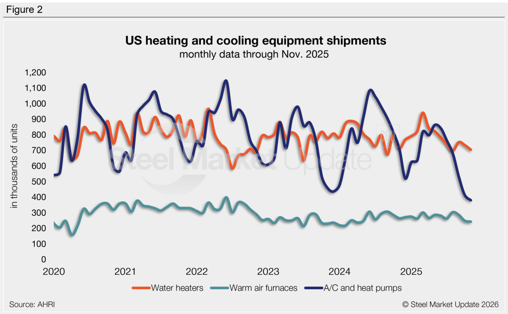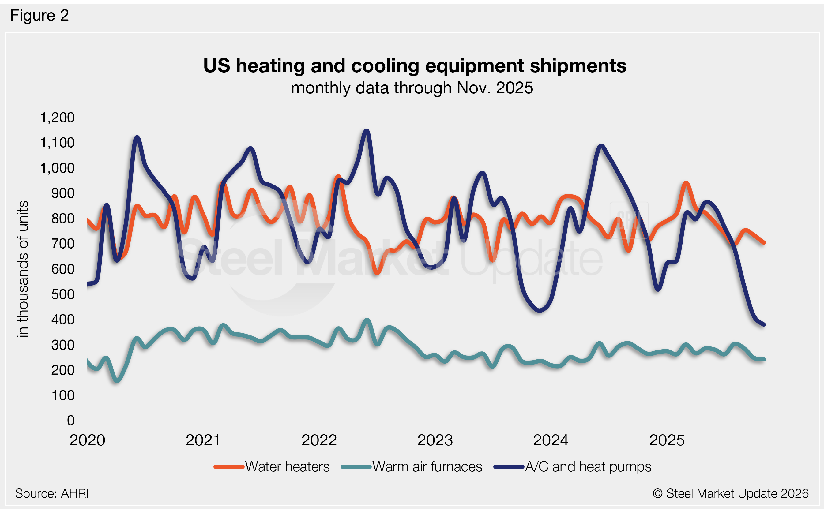 November shipments totaled 1.33 million units, down 5% from October and 21% less than the same month last year (Figure 1, left). Shipments of water heaters, warm-air furnaces, and air conditioners/heat pumps all declined month over month (m/m).