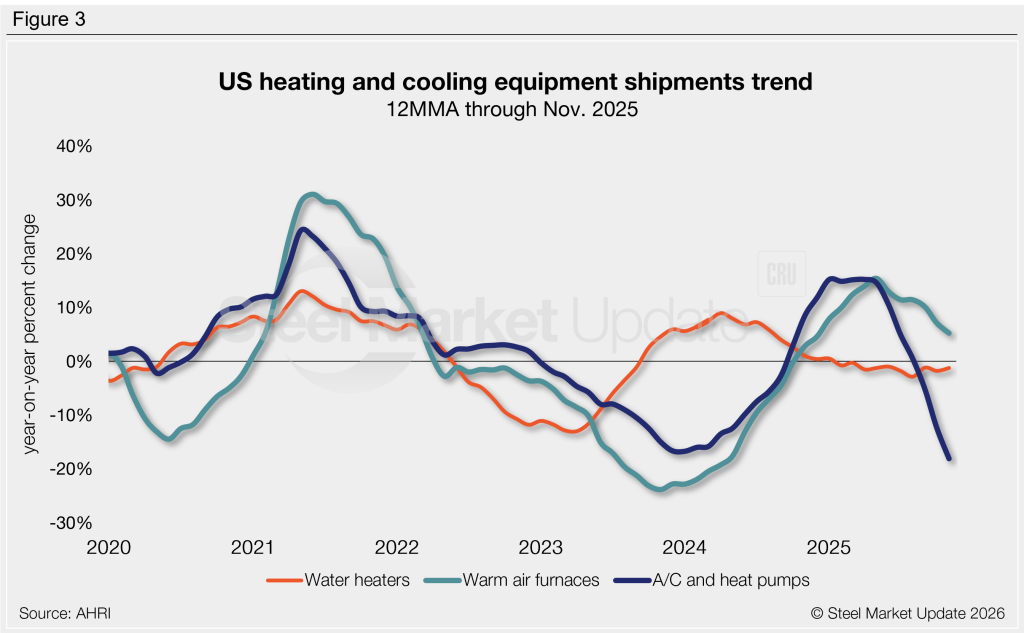 - Air conditioner and heat pump shipments were down 18% y/y on a 12MMA basis. This was the third consecutive month to see negative annual growth and also the largest annual contraction rate in our 16-year data history.