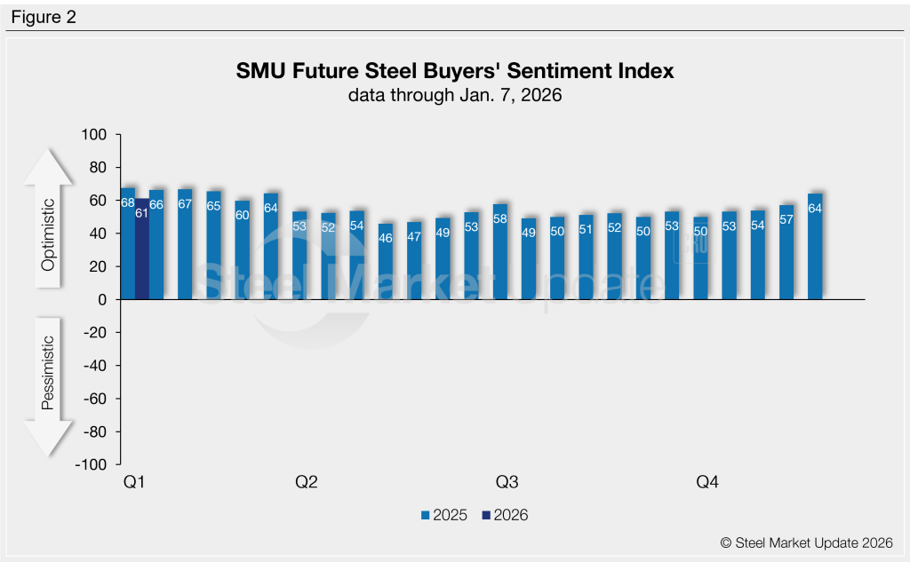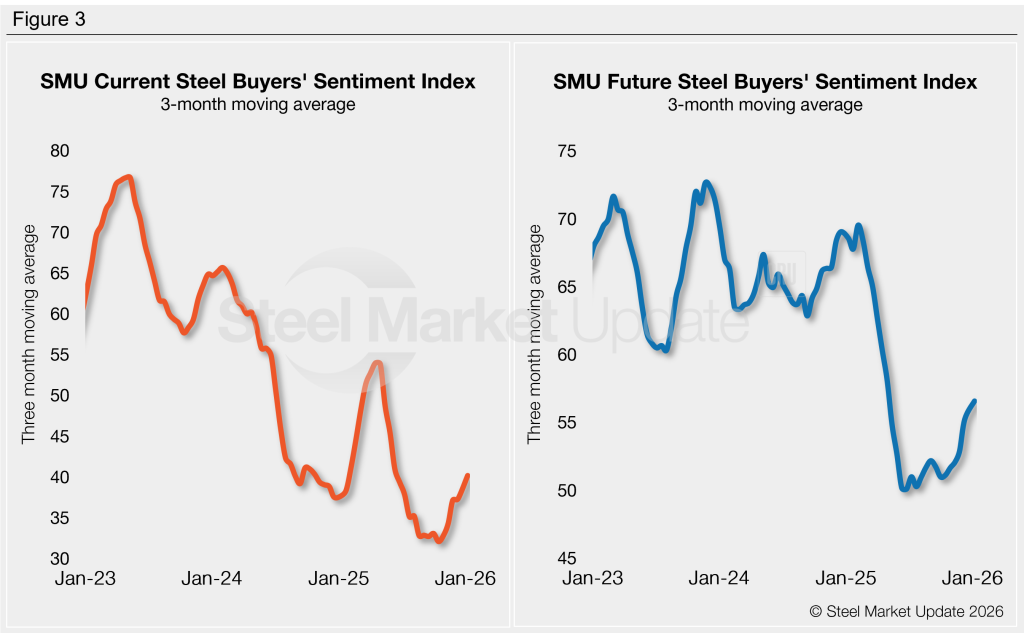 The Current SMU Steel Buyers’ Sentiment Index has rebounded from our previous market check in December. However, Future Buyers’ Sentiment has edged down, according to our latest survey data.