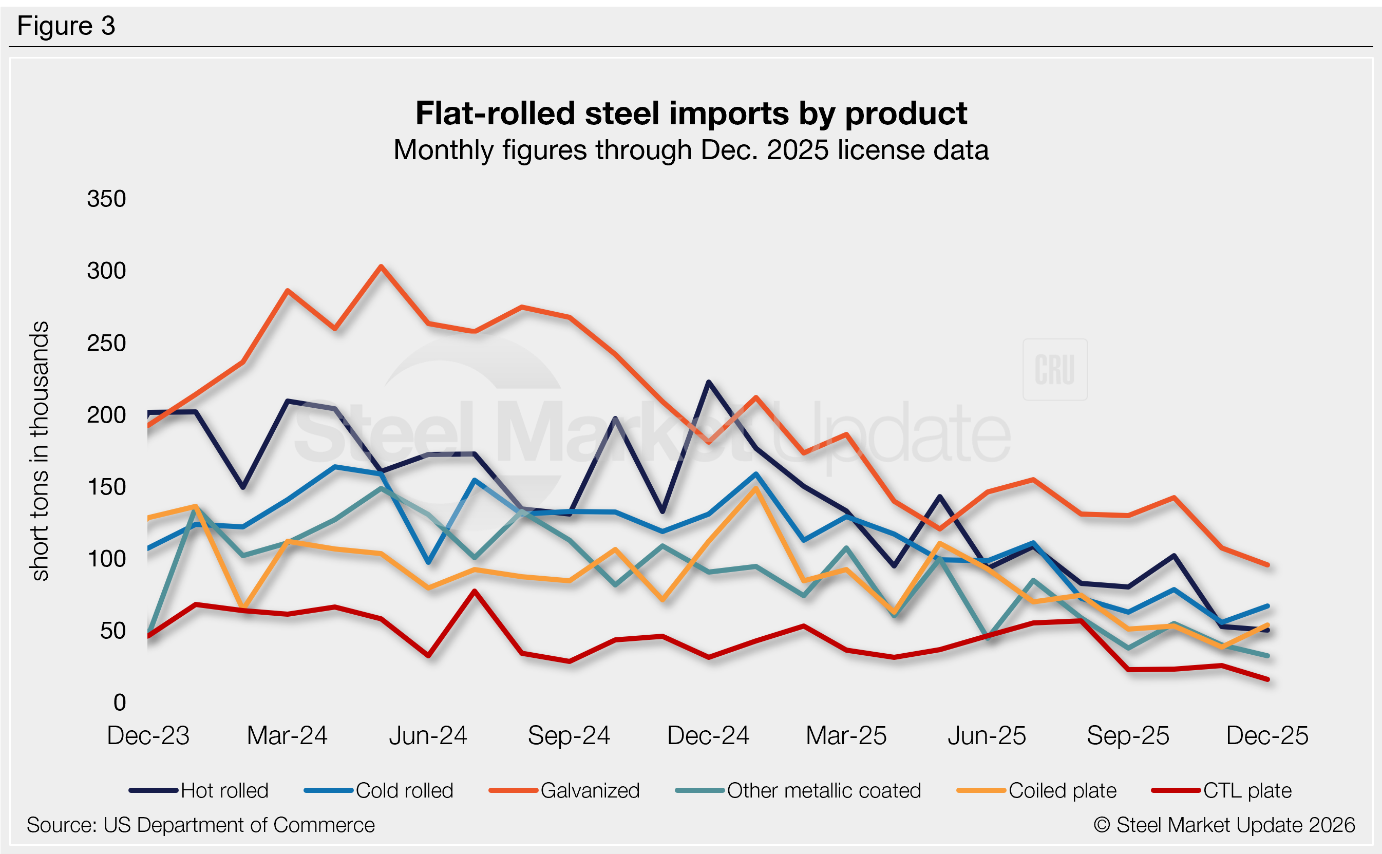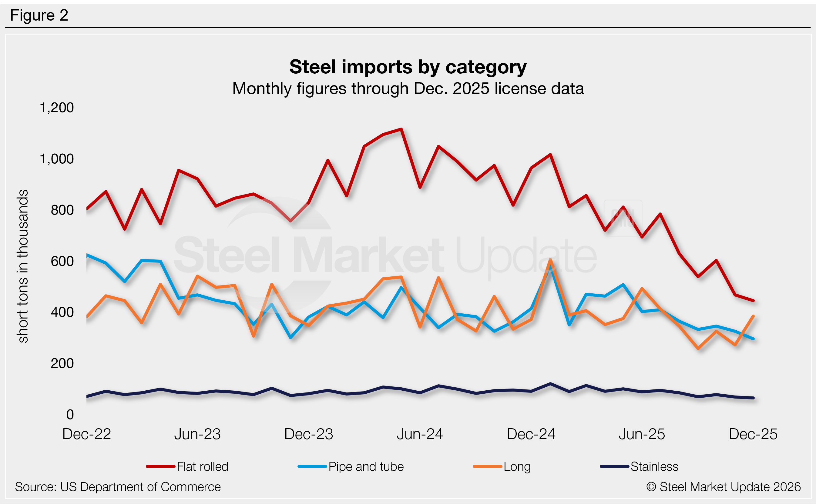 Figure 2 shows monthly imports by popular steel product categories. Notable shifts in the final months of 2025 include:
