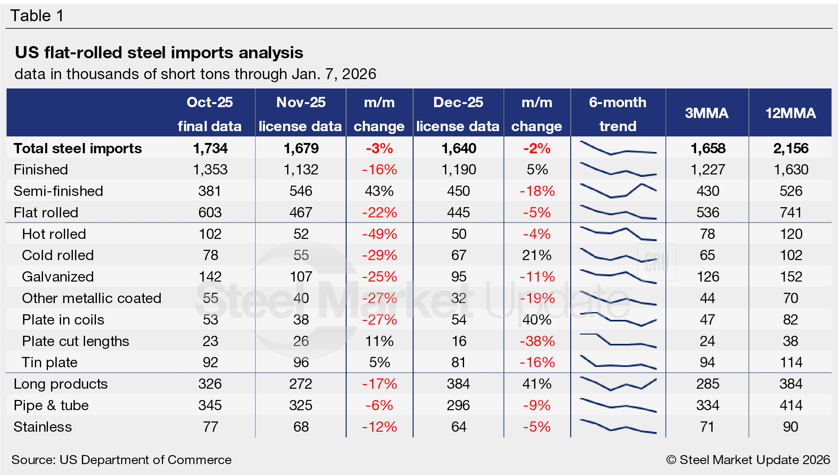 Table 1 highlights high-volume steel product imports (click to expand). Note the 3MMA and 12MMA columns are calculated through November license data. For deeper analysis, visit our Steel Imports page.