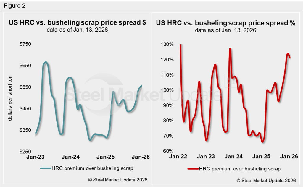 After converting scrap prices to dollars per short ton for an equal comparison, the differential between HRC and busheling scrap prices was $558/st as of Jan. 13. That’s an increase of $20/st from the prior month. Since September, the lowest the spread has been was $438/st as of Sept. 11 of last year (Figure 2).