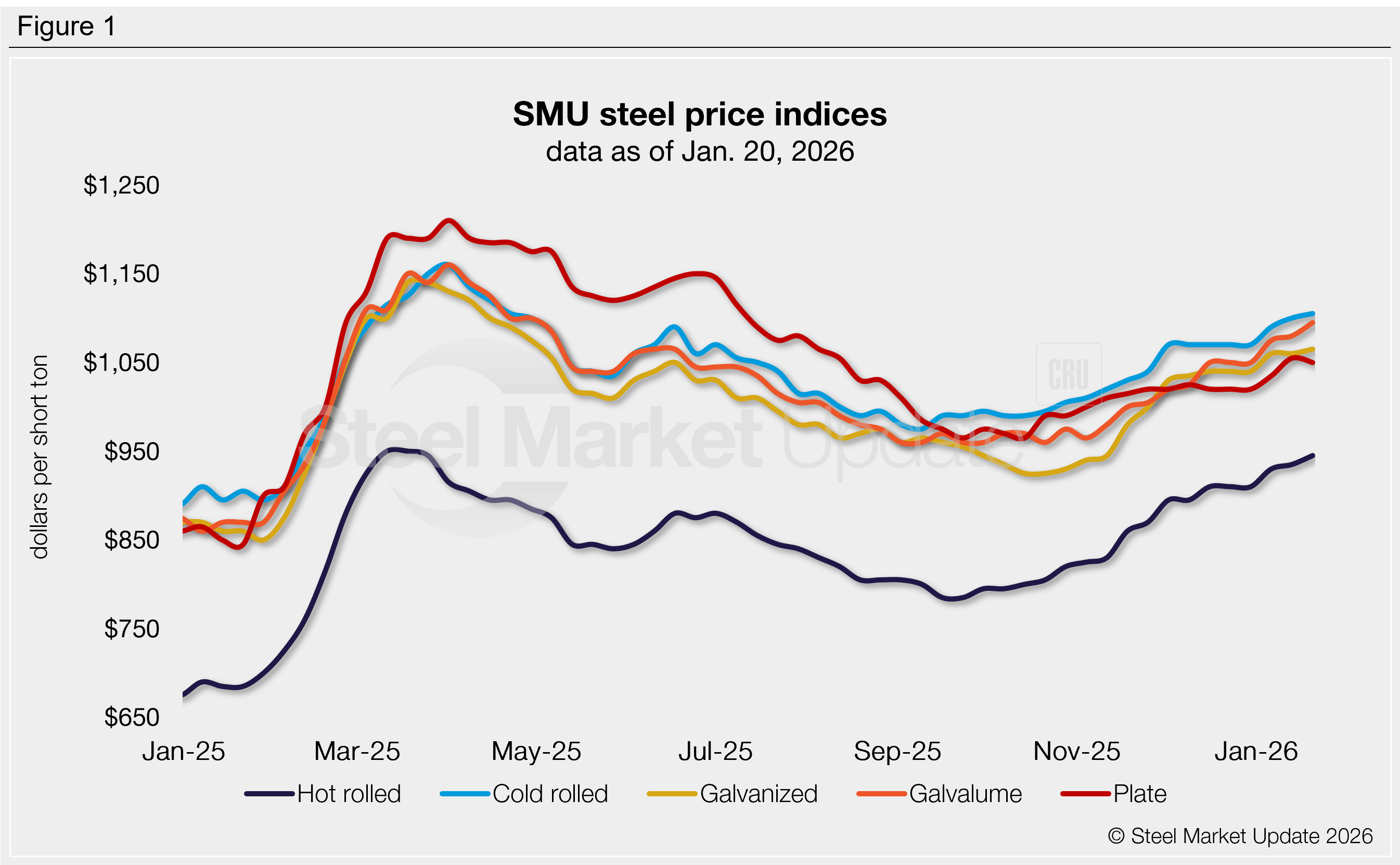 Sheet prices have consistently held steady or moved higher each week since September and have risen $25-45 per short ton (st) over the past month. Plate had seen some momentum in the first two weeks of the year but slipped $5/st this week. Despite this, plate is up $30/st from late December levels.