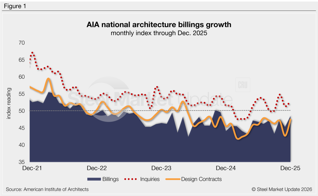 Two of the sub-sector indices were also up from November (institutional and commercial/industrial), but all continue to indicate a reduction in billings. Residential was down 1.1 points to 45.5 (Figure 2, right), while institutional was up 1.1 points to 48.7.